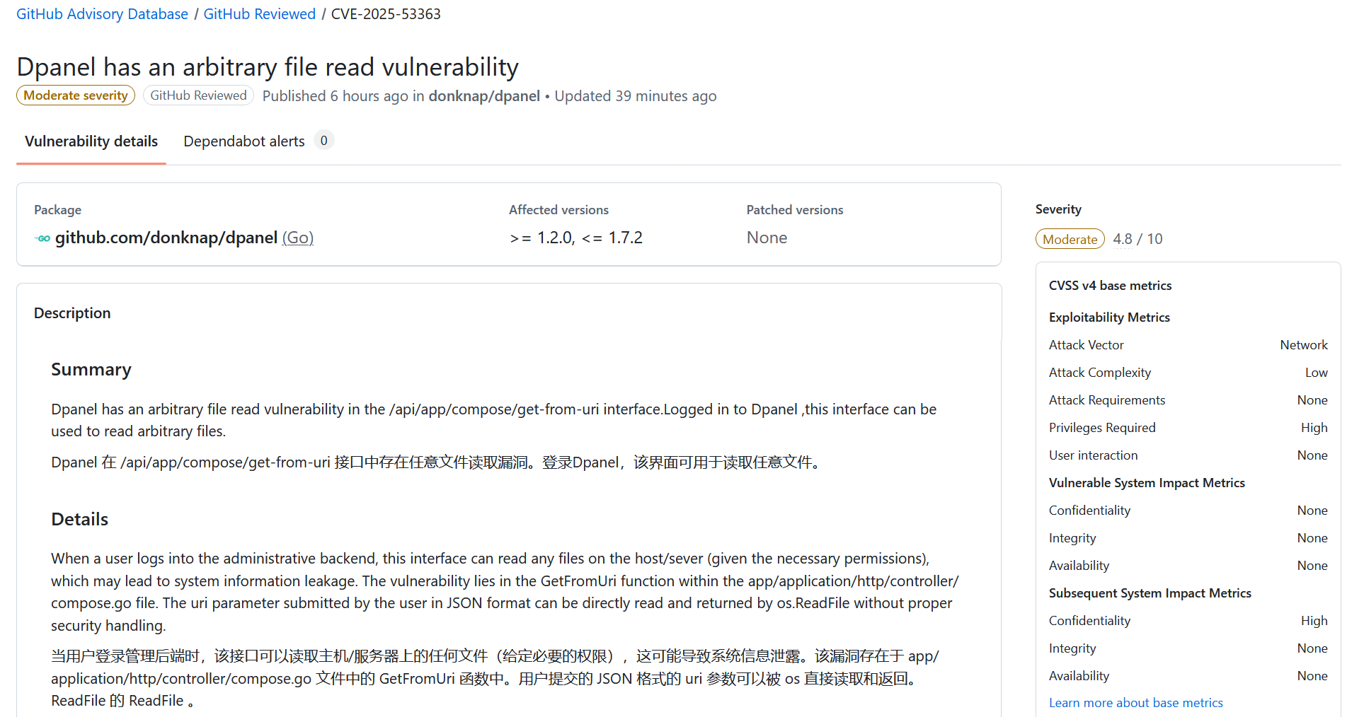 dpanel is an open source server management panel written in Go. In versions 1.2.0 through 1.7.2, dpanel allows authenticated users to read arbitrary files from the server via the /api/app/compose/get-from-uri API endpoint.