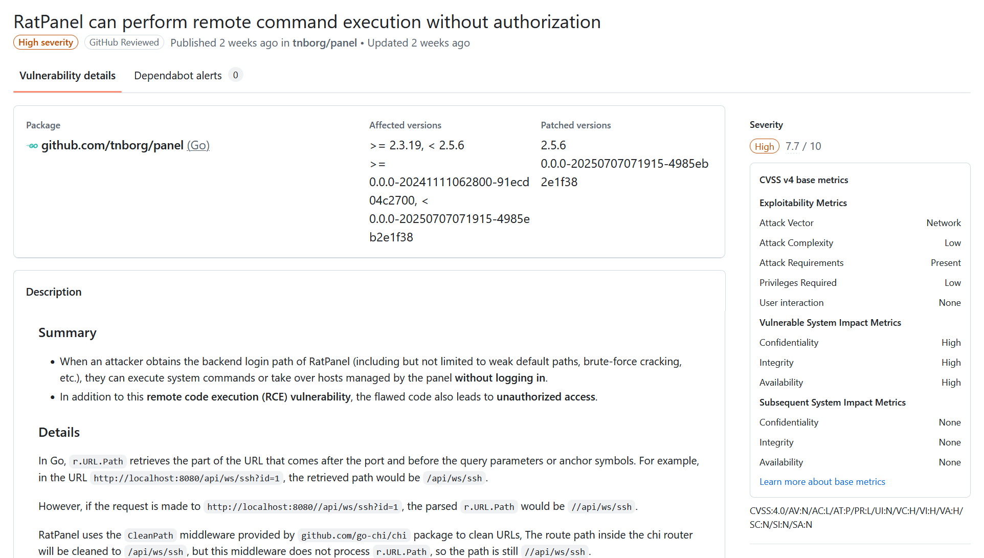 Users running Ratpanel versions v2.3.19 to v2.5.5—especially those who have exposed their admin panel login URL or use weak login URL paths—are vulnerable to unauthorized access. Additionally, versions v2.5.1 to v2.5.5 are susceptible to server and hosted machine takeover.